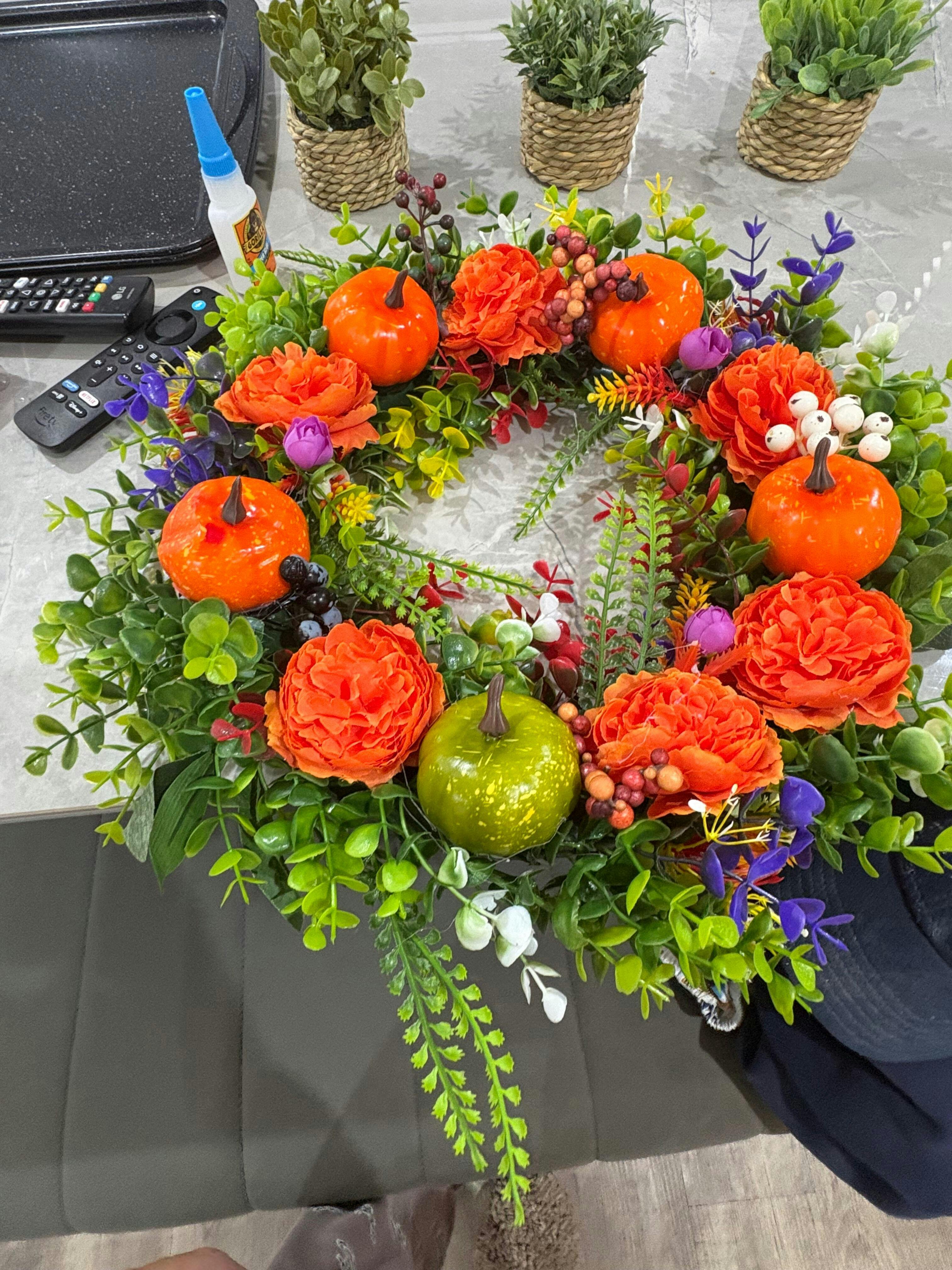 The wreath is tiny compared to the picture and a pumpkin has already fallen off. Very disappointed.